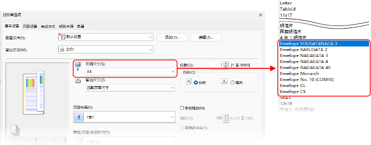 在 [基本设置] 选项卡上的 [页面尺寸] 中,选择信封的尺寸。