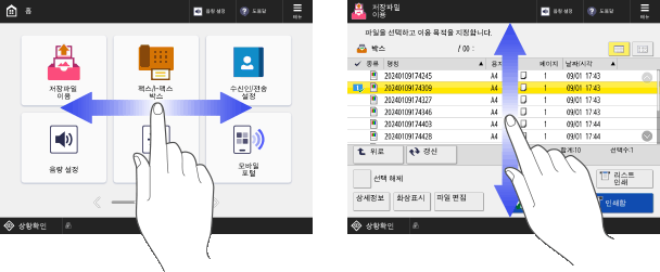 제어판에는 터치스크린이 사용됩니다. 화면에 표시된 항목과 버튼을 손가락으로 직접 터치하여 조작합니다.