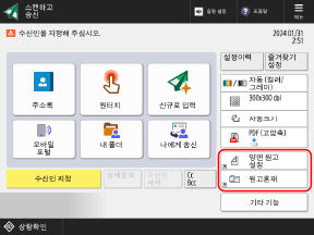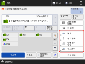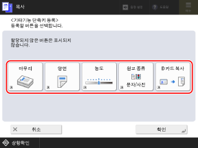 스캔(스캔하고 송신), 팩스 및 복사 화면에 표시되는 다음 버튼을 [기타 기능]에 있는 버튼으로 교체하고, 버튼을 숨길 수 있습니다.