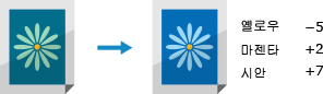 옐로우, 마젠타, 시안 및 블랙의 레벨을 조정하여 원고에 더 충실한 컬러로 복사하거나 원고보다 선명하게 복사할 수 있습니다.