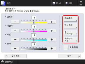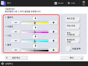 * 모델에 따라서는 [채도조정], [색상 조정] 및 [흑색영역 조정]이 표시되지 않을 수 있습니다.