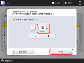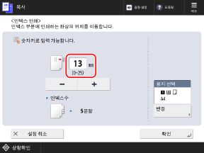 동일한 페이지에 두 장 이상의 인덱스지를 삽입하려면 버튼을 눌러 선택하고, 숫자키를 사용하여 삽입할 매수를 지정합니다.