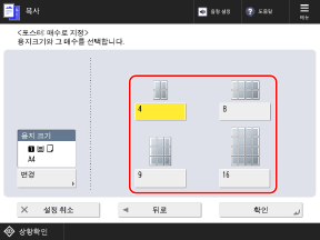 분할해서 복사하려면 원고의 배율을 지정하거나 사용할 용지와 매수를 지정하면 됩니다.