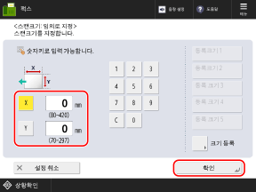 [크기 등록]을 누릅니다.  크기를 등록할 버튼을 선택합니다.  [등록/편집]을 누릅니다.  [X] 측과 [Y] 측 길이를 입력합니다.  [확인]  [닫기]를 누릅니다 |