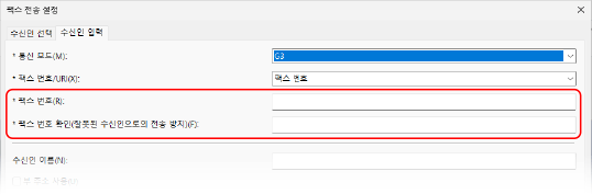 [수신인 입력] 탭에서 팩스 번호를 입력합니다. 값을 입력할 수 있는 경우에는 [팩스 번호 확인]에 동일한 팩스 번호를 입력합니다.