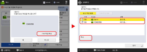 다른 작업을 취소하려면 [기타 작업 확인]을 누르고, 송신작업 리스트에서 취소할 작업을 선택한 후 [취소]를 누릅니다.