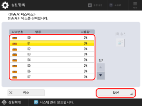 전송처나 저장 위치로 사용할 팩스박스를 선택하고 [확인]을 누릅니다.