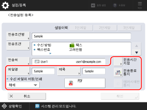 * 전송 또는 저장용 팩스박스를 지정하면 [전송시간 지정] 설정만 구성할 수 있습니다.
