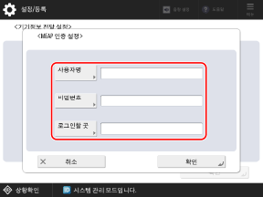 제어판을 사용하여 인증 정보를 설정합니다. 컴퓨터에서 리모트 UI를 사용하여 이 정보를 설정할 수 없습니다.