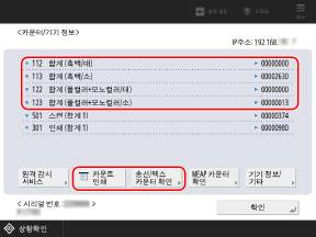 [송신/팩스 카운터 확인]을 눌러 스캔하고 송신한 페이지 수와 팩스로 송신한 페이지 수를 확인합니다.