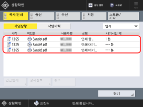 * 앞 작업이 인쇄 중단 작업인 경우에는 앞 작업이 완료된 후에 선택한 작업이 실행됩니다.