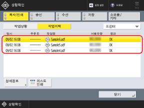 [작업이력 표시]인쇄 작업 상태 보기