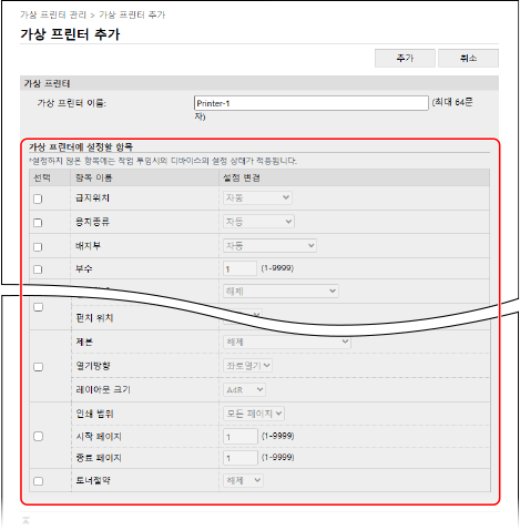 [가상 프린터 설정]에서 인쇄 설정을 구성합니다.
