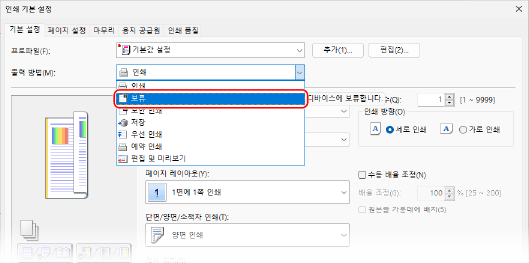 드라이버의 인쇄 설정에서 홀드 기능을 설정하고 홀드된 문서를 기기로 전송할 수 있습니다.