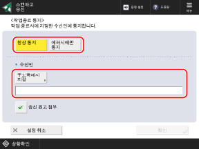 주소록에 등록된 수신인(개인 주소 리스트 또는 사용자 그룹 주소 리스트에 있는 수신인 제외) 또는 로그인 사용자의 이메일 주소를 통지처로 설정할 수 있습니다.