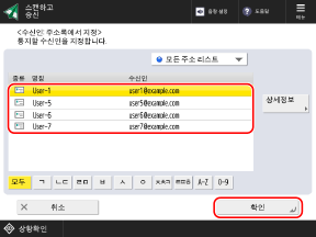 주소록 화면에서 통지처로 설정할 수신인(이메일 주소)을 선택하고 [확인]을 누릅니다