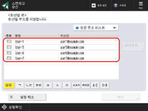 화면 하단 또는 주소 리스트 풀다운 메뉴의 주소 리스트에서 색인을 선택하여 리스트에 표시되는 수신인을 필터링할 수 있습니다.