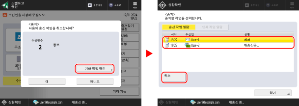 다른 작업을 취소하려면 [기타 작업 확인]을 누르고, 송신작업 리스트에서 취소할 작업을 선택한 후 [취소]를 누릅니다.