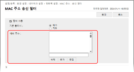 예외 주소가 등록되고, IP주소 필터 설정을 구성하는 화면이 다시 표시됩니다.
