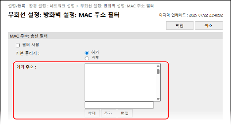 기기가 동시에 두 가지 네트워크에 연결된 경우에는 부회선용 Mac 주소 필터 설정을 구성합니다.