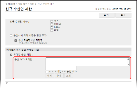 이메일과 I-팩스 수신인을 특정 도메인의 주소로 제한할 수 있습니다. 그리고 특정 도메인으로의 송신을 허용하면서 서브 도메인으로의 송신은 제한할 수 있습니다.