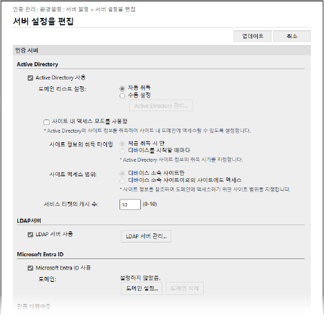 Active Directory, LDAP 서버 또는 Microsoft Entra ID 정보를 [인증 서버]에 구성합니다.