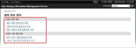 컴퓨터에서 리모트 UI를 사용하여 사용자 설정 정보를 삭제합니다. 제어판을 사용하여 이 정보를 삭제할 수 없습니다.