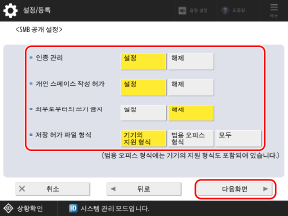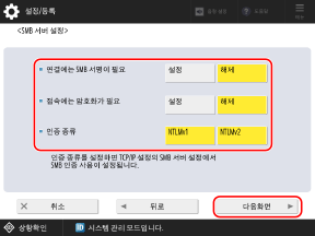 *27단계에서 [인증 종류]를 설정한 경우에는 [SMB서버 설정]의 [SMB 인증 사용]이 연결되고 활성화됩니다.