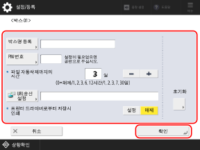 [파일 자동삭제까지의 시간] 및 [프린터 드라이버로부터 저장시 인쇄] 설정을 모든 메일함에 동시에 구성할 수 있습니다.