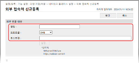 네트워크상의 다른 기기나 파일 서버(Windows 서버)에 있는 고급 박스에 직접 액세스하여 사용하려면 액세스할 때 사용되는 정보를 접속처로 등록해야 합니다.