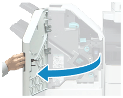 다음 단원에서는 중철 유닛에 걸린 스테이플을 제거하는 방법을 설명합니다. 제어판에 표시되는 지시에 따라 스테이플 위치를 확인하고 걸린 스테이플을 제거합니다.