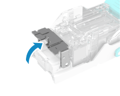 녹색 표시가 있는 부분이 앞쪽을 향하도록 스테이플 카트리지를 잡고, 스테이플 카트리지를 끝까지 단단히 밀어넣은 다음, 녹색 표시가 있는 부분을 올려서 잠급니다.