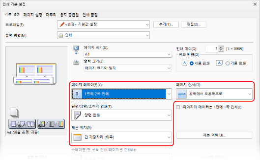 [페이지 레이아웃]이 [1면에 1쪽 인쇄] 이외의 설정으로 설정된 경우 [페이지 순서]가 표시됩니다.