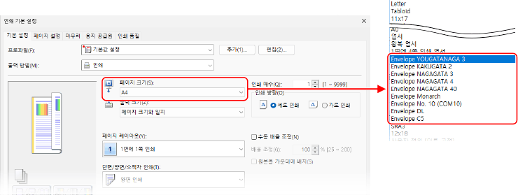 [기본 설정] 탭의 [페이지 크기]에서 봉투 크기를 선택합니다.