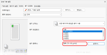 [용지 공급원]을 클릭합니다.