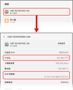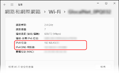 按一下 [詳細設定] 並在顯示的畫面上檢查 IP 位址。