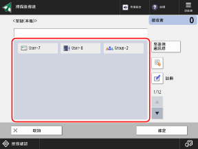 您可以從掃描(掃描後傳送)或傳真畫面叫用通訊錄來指定在通訊錄中註冊的目的地。