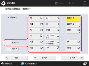 將紙張裝入多用途紙盤後,控制台中會顯示紙張設定的畫面。