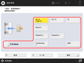 根據信封的方向,按下 [長頁邊輸送] 或 [短頁邊輸送],然後選擇信封的尺寸。