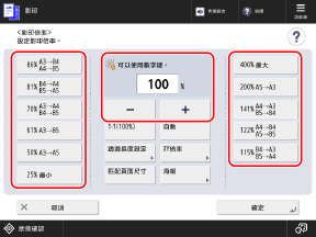 從清單中選擇固定影印倍率或輸入自訂影印倍率。