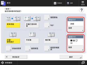 按下 [原稿尺寸] 項下的 [變更],選擇原稿尺寸,然後按下 [確定]。