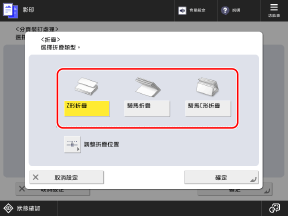 如果您在步驟 1 中按下 [騎馬折疊],您可以按下 [調整折疊位置] 調整每種紙張尺寸的折疊位置。