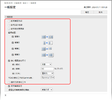 預設情況下,只在紙張的單面列印已接收的傳真和 I-Fax 的影像。您可以變更設定,在紙張的雙面進行列印,並在列印時添加接收日期和時間、頁碼和其他資訊。