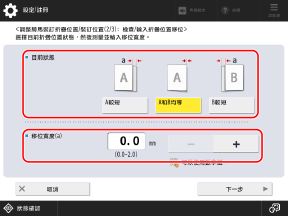 在測試頁上檢視目前裝訂位置狀態和偏移寬度,然後選擇目前狀態並設定偏移寬度。
