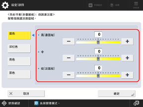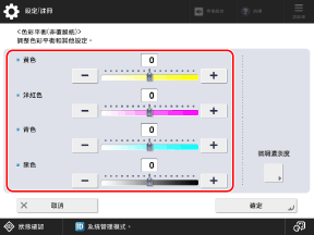 彩色列印時調整黃色、洋紅色、青色和黑色的色彩平衡。您可以調整每種色彩的三個濃淡度區域等級。
