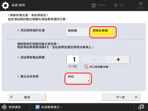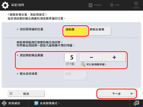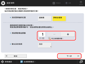 對於 [測試頁掃描的位置] 選擇 [送稿機],設定要輸出的張數,然後按下 [下一步]。
