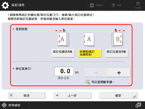 對於 [變更折疊/裝訂位置],按下 [+] 將騎馬釘裝訂位置移向列印面右側,按下 [-] 將騎馬釘裝訂位置移向列印面左側。