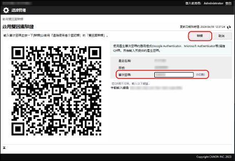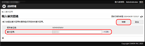 使用使用者名稱「Administrator」登入時,請將預設密碼「7654321」變更為新密碼。[註冊/編輯認證使用者]