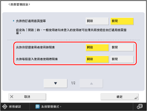 設定為 [開啟] 允許管理員以外的使用者新增共用按鈕並變更 [自訂通用首頁螢幕] 設定。