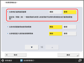 若要限制每位使用者在 [首頁] 畫面上可以自訂的項目,請按下 [設定],對於每個要限制的項目選擇 [關閉],然後按下 [確定]。